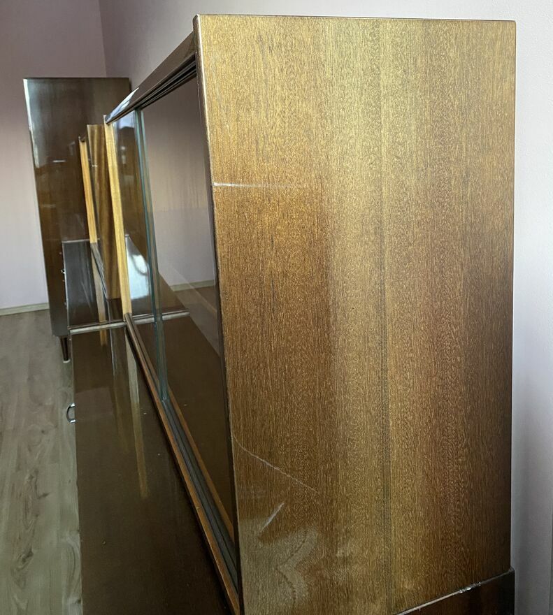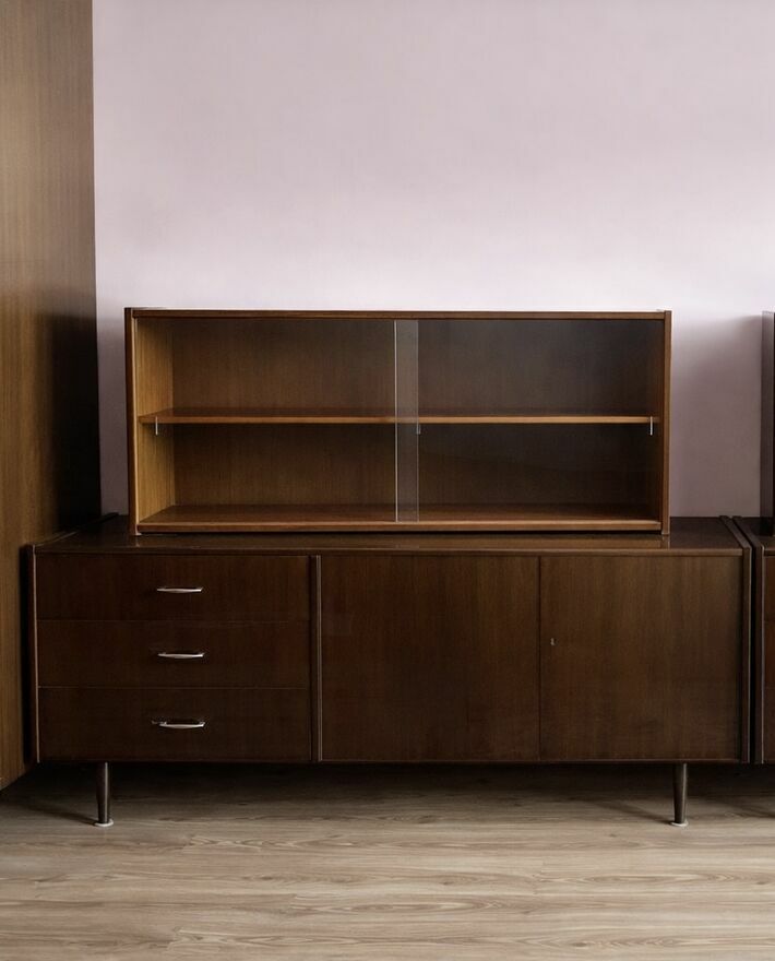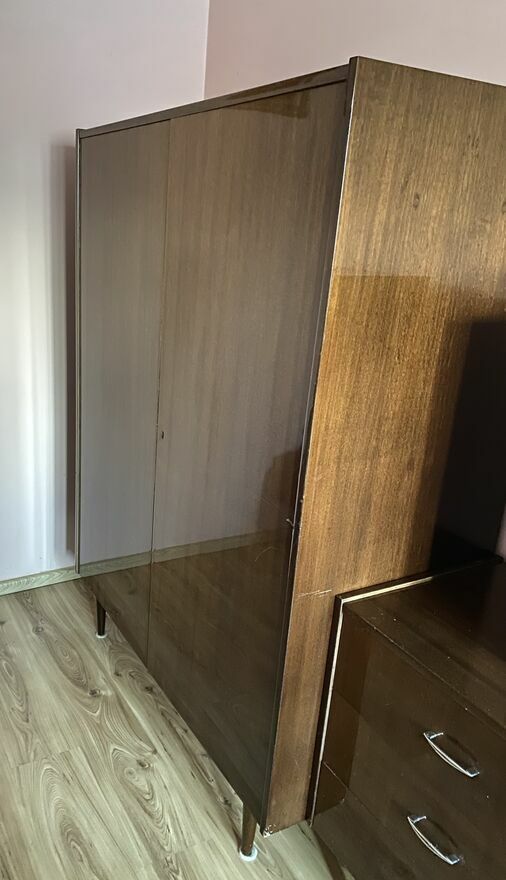 Na sprzedaż oryginalne meble: komody + szafa + nadstawki z oszkleniem z okresu PRL, typ Walentyna V, wyprodukowana przez Spółdzielnię Pracy Przemysłu Meblarskiego w Krotoszynie (SPM).Mebel wykonany w okleinie mahoń, wykończenie wysoki połysk (lakier poliestrowy), zgodnie z normą PN-66-F-06002. Klasyczny design lat 60./70., charakterystyczny dla polskiego wzornictwa tamtego okresu. Stan zachowania zgodny z wiekiem (szczegóły widoczne na zdjęciach). Idealna propozycja dla miłośników designu PRL. Cena za cały zestaw: 2500 zł. Istnieje również możliwość sprzedaży pojedynczej komody wraz z nadstawką po rozdzieleniu zestawu – dla osób zainteresowanych proszę o kontakt.